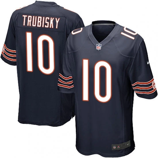 Represent your favorite team and player with this high quality Chicago Bears Mitchell Trubisky Game Jersey features vivid team logos and colors, a tailored fit for movement, strategic ventilation for breathability and screen printed player name and number. The no-tag neck label provides clean comfort with a woven jock tag at front lower left and shield at the V-neck. Enjoy the game!